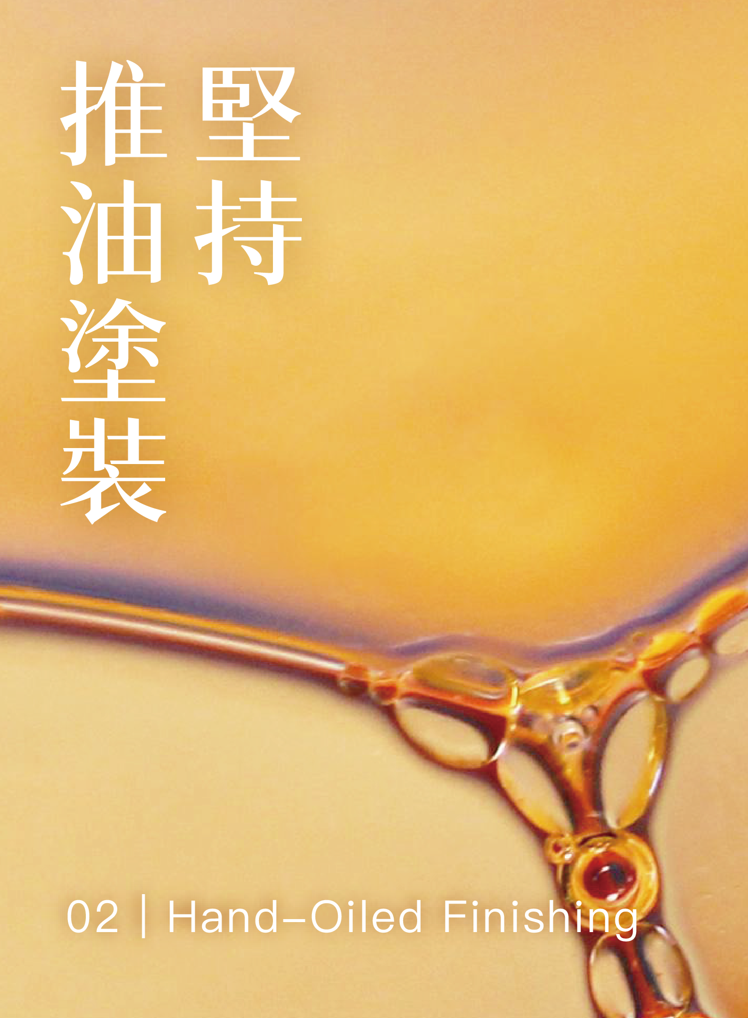 我們使用德國原裝護木油,讓天然植物油滲進木頭,沒有甲醛、沒有殘留,只想留下安心與真實的觸感:「讓每一次觸摸,都是與自然更近一步的對話。」