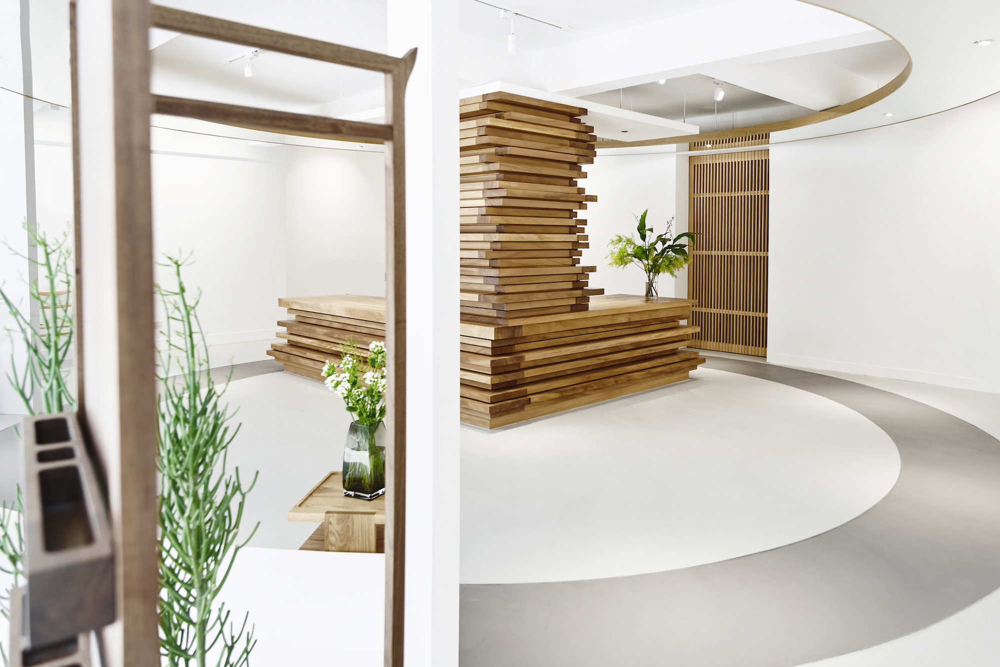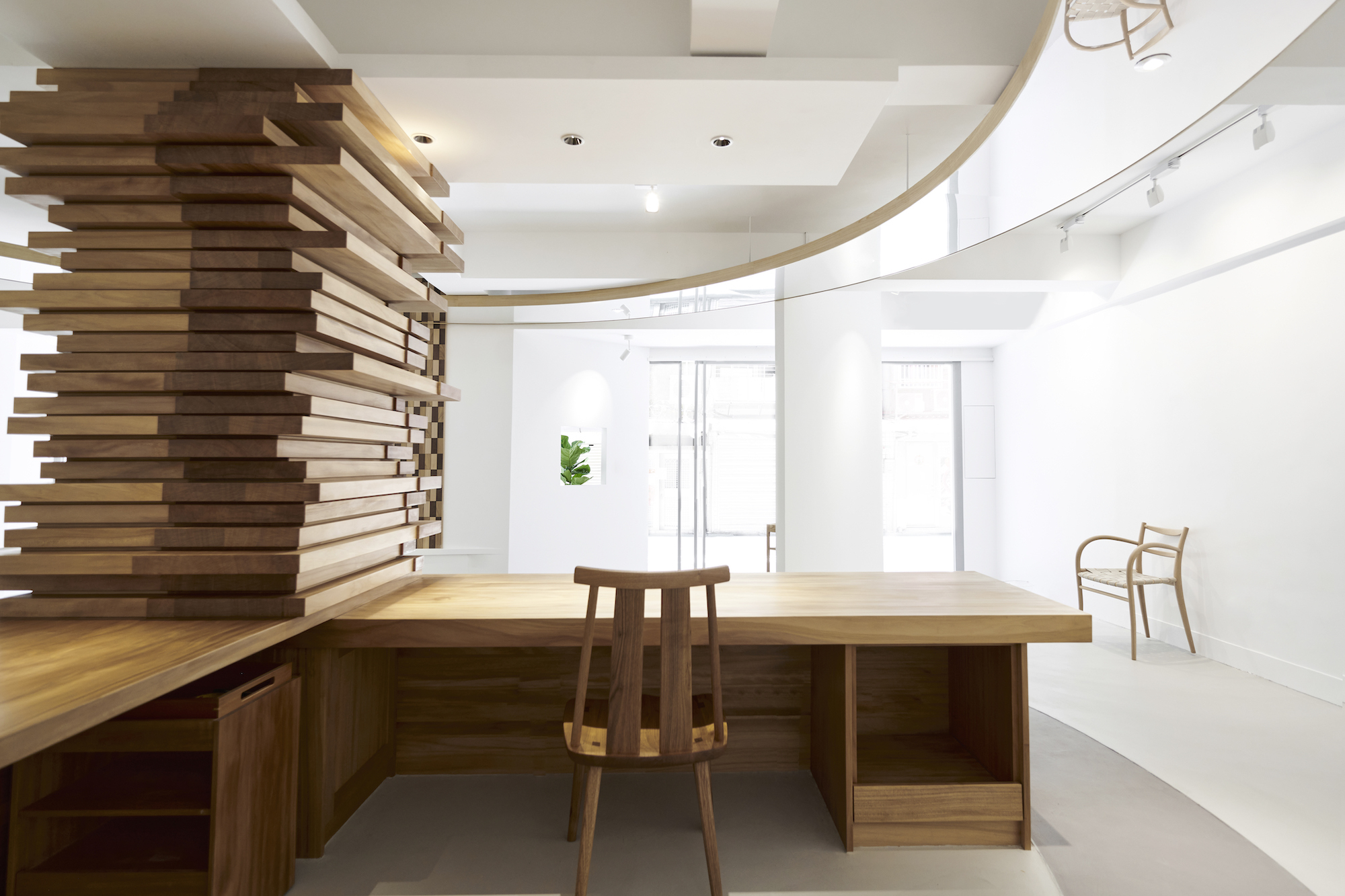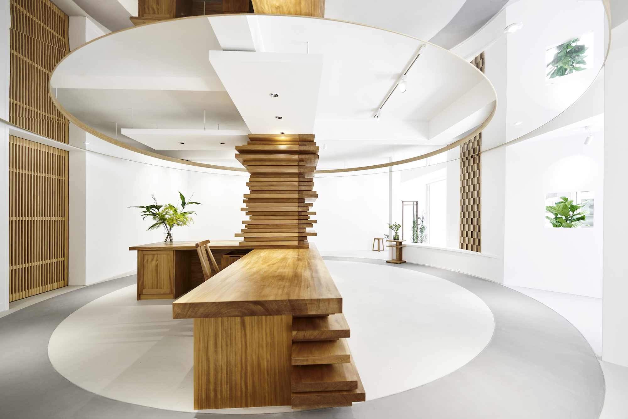 天花板與地板的圓弧造型,宛若樹木的年輪,訴說著樹的故事,而這片靜謐之地,即使位於繁華都市之心,也能讓人深切感受到純樸自然的生活質感。