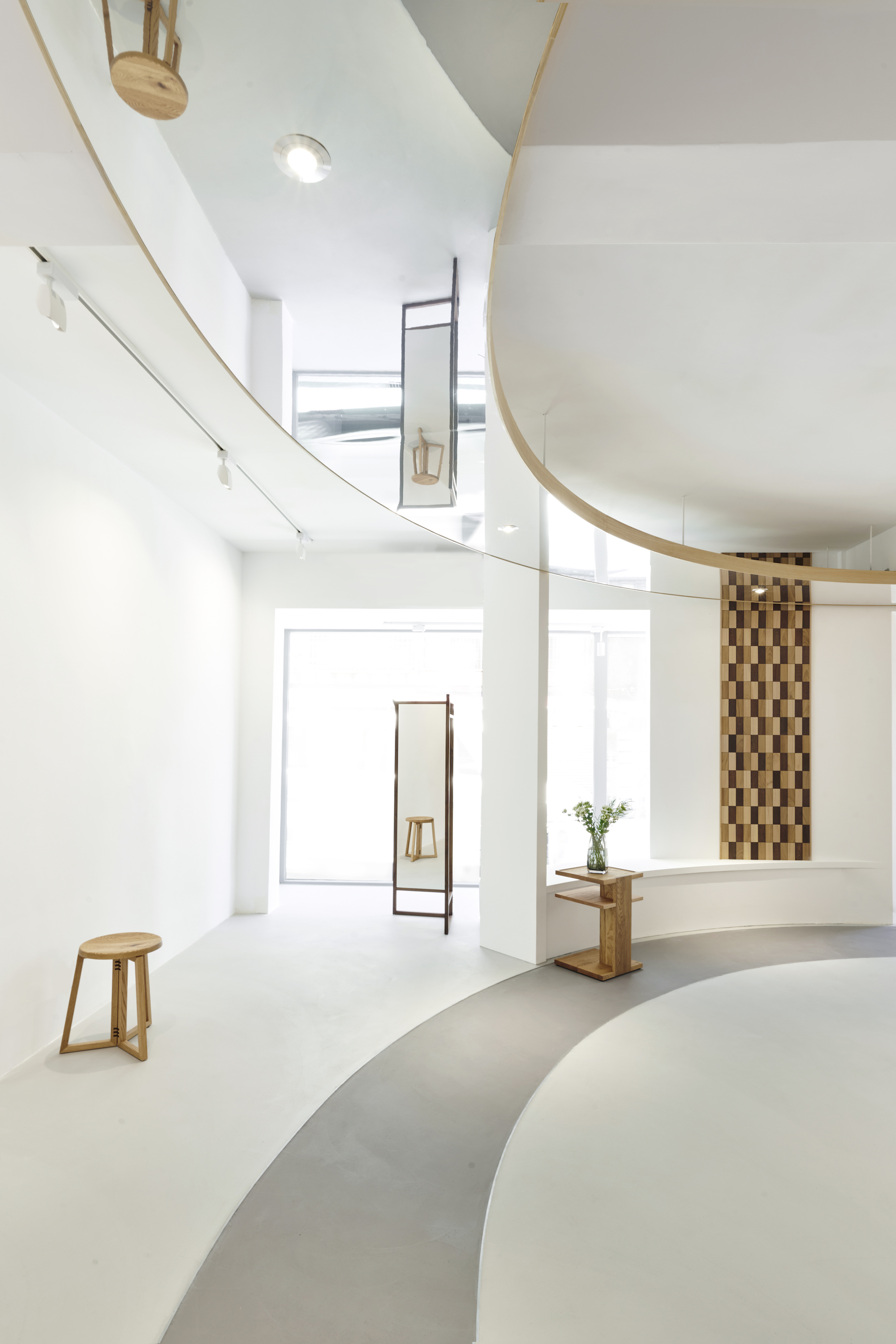 回到天花板上的鏡面材料反射出店內的動態空間,讓你從多角度體會原木的質感。